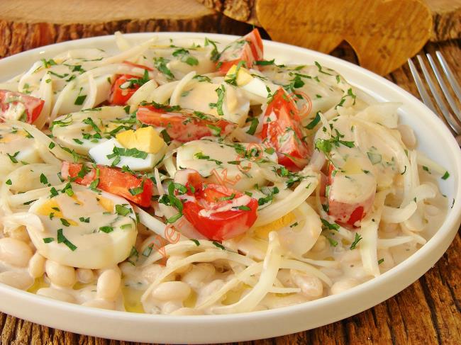 Fırında haşlanmış fasulye, domates ve kırmızı soğanın üzerine isteğe göre tahin sosu, haşlanmış yumurta ve maydanoz eklenir.